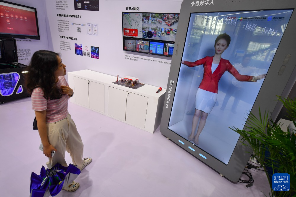 7月12日,参观者在中国新媒体技术展上参观全息数字人。 新华社记者 陈泽国 摄