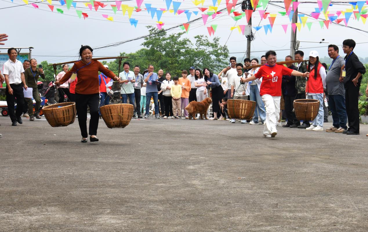 5月1日,常宁市板桥镇先峰村“趣闹春耕”农民趣味运动会上,参赛群众在进行“挑担接力”比赛。