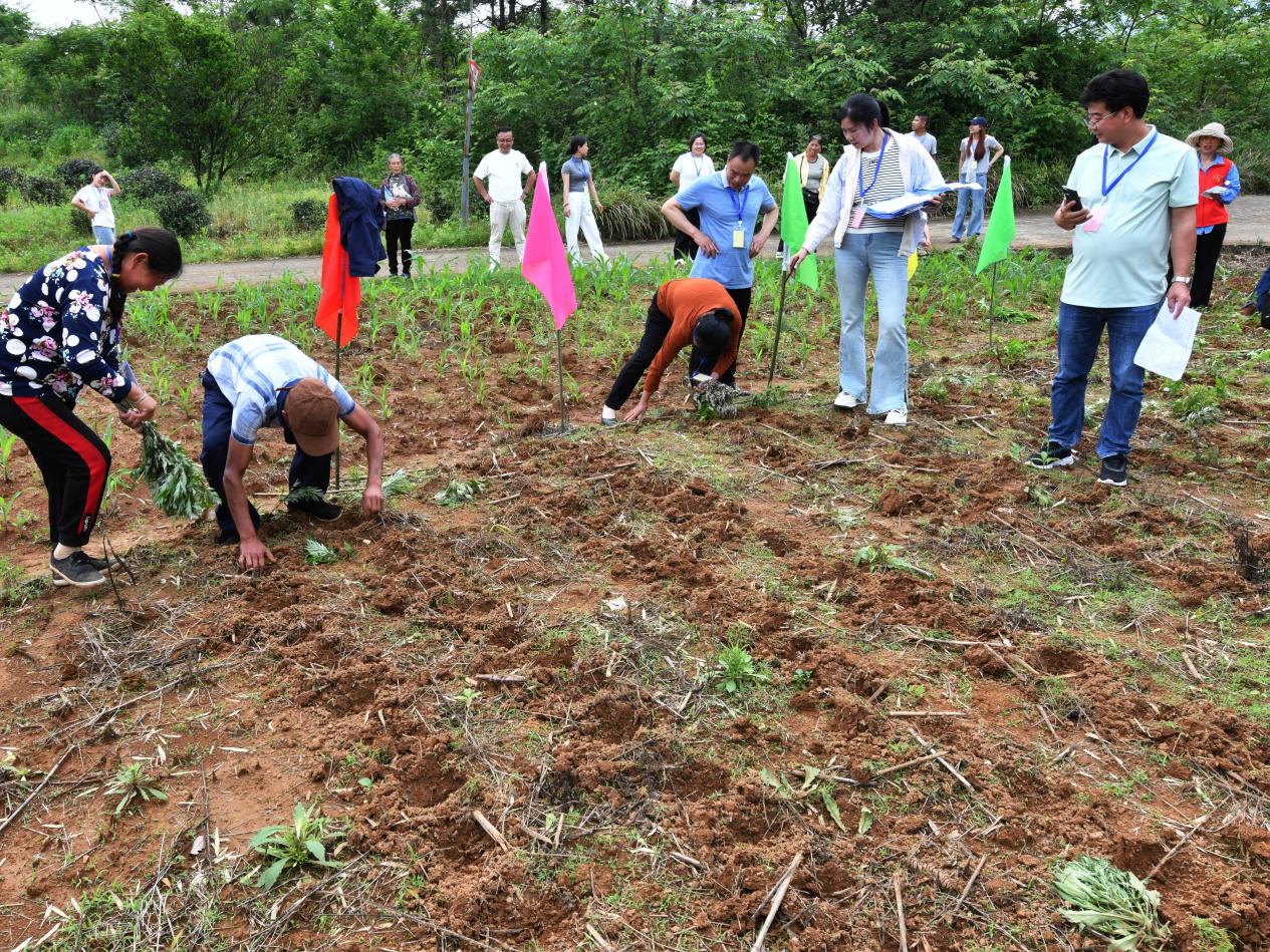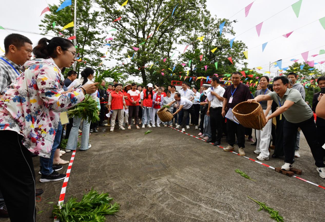 5月1日,常宁市板桥镇先峰村“趣闹春耕”农民趣味运动会上,参赛群众在进行“薯苗移栽”比赛。
