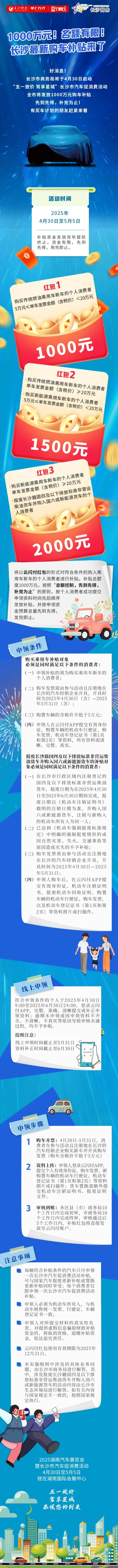 4月30日至5月5日,长沙开展“五一放价驾享星城”2025长沙市汽车促消费活动。活动投入资金1000万元,面向长沙市范围内购入乘用车新车的个人消费者、报废长沙籍国四及以下排放标准非营运柴油货车并购入国六或新能源货车的个人消费者,发放云闪付红包补贴,最高每台车补贴2000元,符合条件的购买乘用车可叠加国家汽车置换更新或报废更新补贴使用,最高补贴2.2万/台。