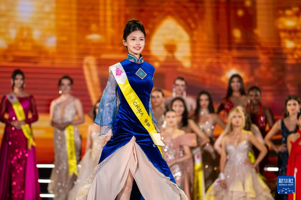 10月2日,巴西选手布鲁娜·阿曼达·塞茨在进行晚礼服走秀,最终她获得了本届大赛亚军。新华社记者 陈思汗 摄pagebreak
