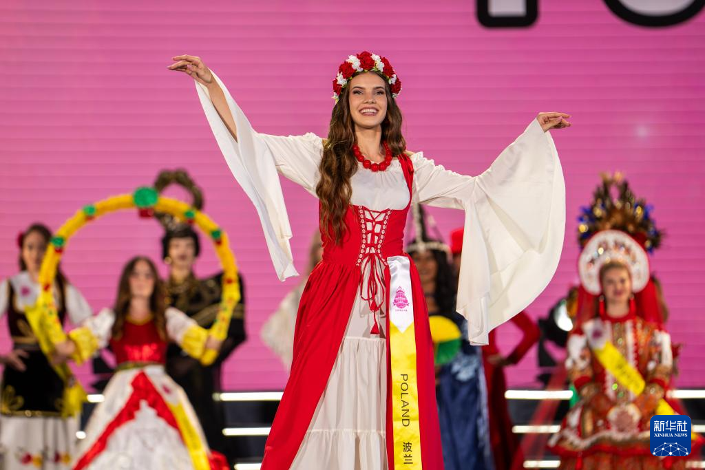 10月2日,波兰选手卡罗利娜·奥利维娅·皮克萨在进行民族服饰走秀,最终她获得本届大赛冠军。新华社记者 陈思汗 摄pagebreak