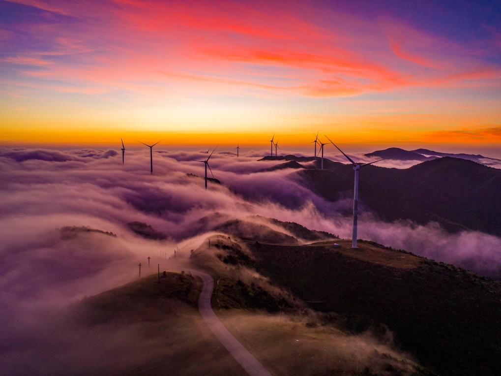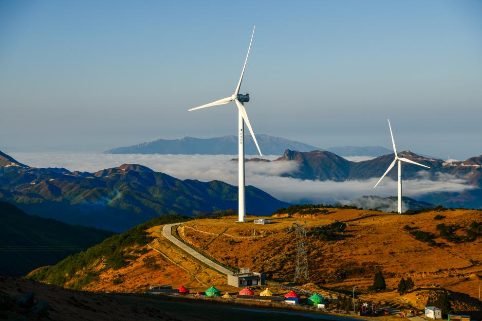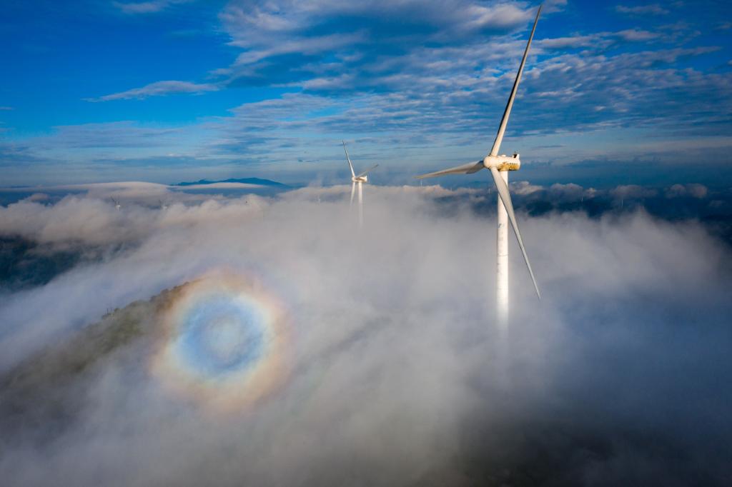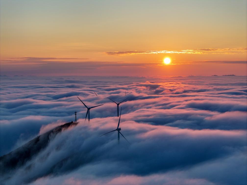 华电新能湖南分公司仰天湖风电场。云海翻涌,中国华电风机列阵山脊。(肖胜男 摄)pagebreak