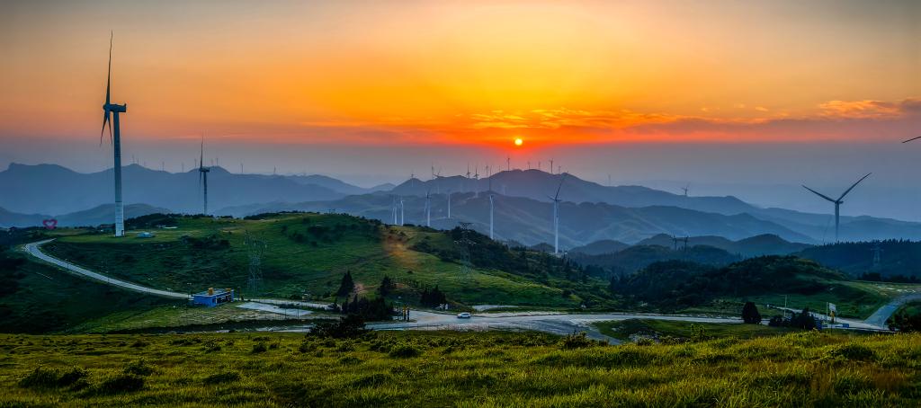 华电新能湖南分公司仰天湖风电场。余晖流金,一排排风车在绚烂的天空下形成静谧的剪影。(华电新能湖南分公司 供图)pagebreak