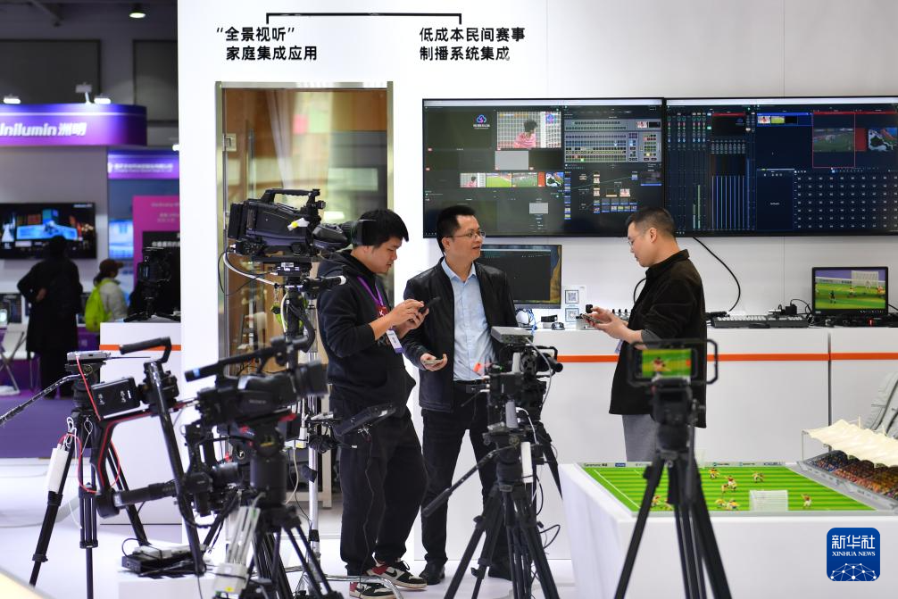 11月12日,观众在2025中国新媒体技术展上了解拍摄、转播设备。