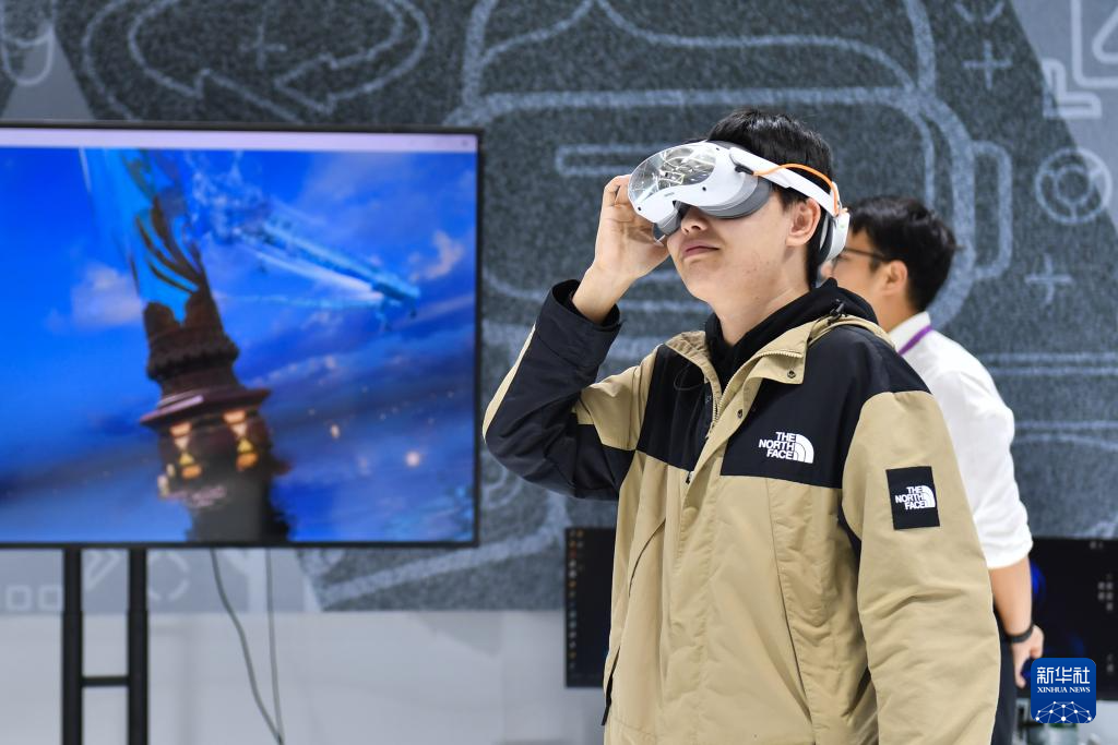 11月12日,观众在2025中国新媒体技术展上体验一款VR设备。