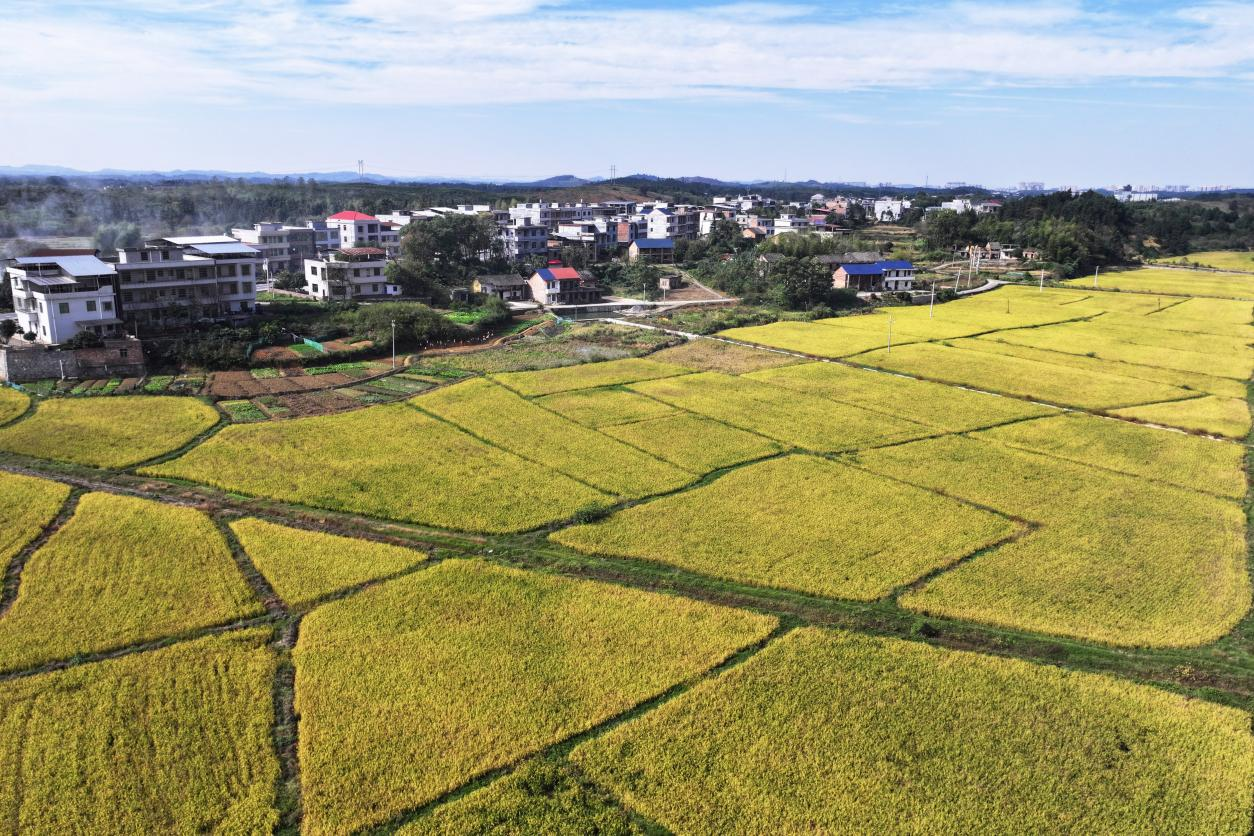 11月19日,常宁市罗桥镇马桥村,连片晚稻田仿佛金色海洋(无人机照片)。