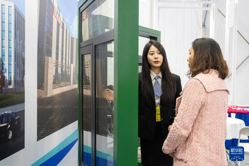 11月27日,在娄底经开区电力科技谷,参展商(左)在介绍复合材料门窗。新华社记者 陈思汗 摄