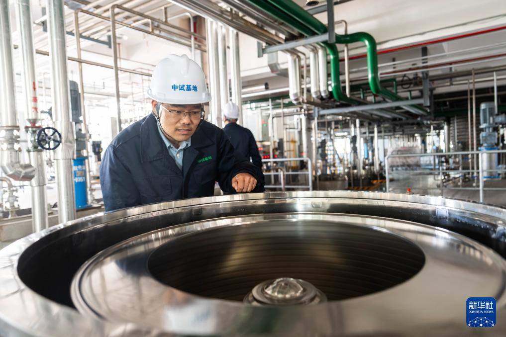 12月1日,在津市高新区的湖南慕恩生物科技有限公司液体发酵车间,工作人员观察种子罐内的菌种发酵情况。新华社记者 陈思汗 摄