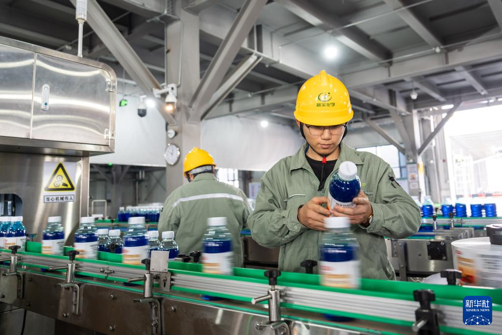 12月1日,在津市高新区的湖南利尔生物科技有限公司制剂车间,工作人员抽检除草剂成品。新华社记者 陈思汗 摄pagebreak