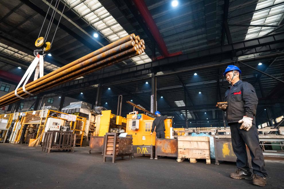 12月11日,在位于桃源县陬市镇观音桥村的湖南飞沃新能源科技股份有限公司生产车间,工人在吊运制作风机叶片紧固件产品的原材料。新华社记者 陈思汗 摄pagebreak