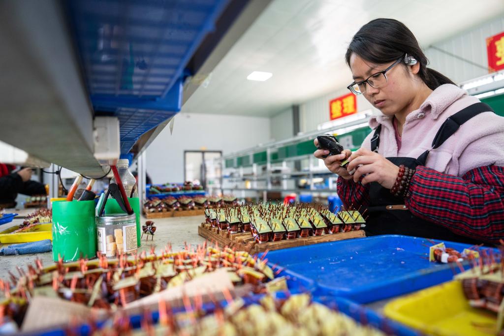 12月11日,在位于桃源县西安镇集镇安置小区的常德市金磁电器有限公司乡村车间,工人在检查电感器产品品质。新华社记者 陈思汗 摄