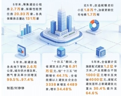 住房条件更优。“十四五”期间,全省商品房销售面积达2.94亿平方米,城镇人均住房面积49平方米,各类保障房总量达131万套,对城镇低保、低收入住房困难家庭实现应保尽保。城镇老旧小区累计改造1.8万个,加装更新住宅电梯1.7万部,住宅小区物业服务覆盖率超75%。