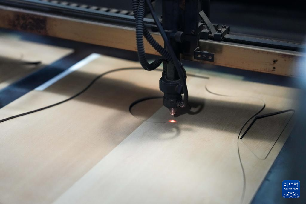 1月7日,一台激光切割机在位于湖南宁乡的湖南省卡玛乐器制造有限公司生产车间切割吉他面板。新华社记者 薛宇舸 摄pagebreak