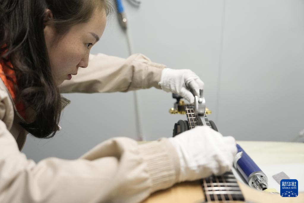 1月7日,研发人员在湖南宁乡的湖南省卡玛乐器制造有限公司研发试验室手工制作一把定制吉他。新华社记者 薛宇舸 摄
