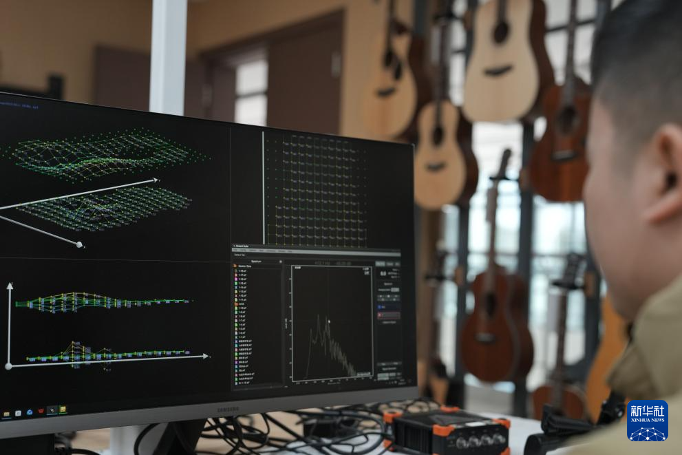 1月7日,研发人员在位于湖南宁乡的湖南省卡玛乐器制造有限公司研发试验室观察一把吉他发声时的面板、背板振动情况。新华社记者 薛宇舸 摄pagebreak