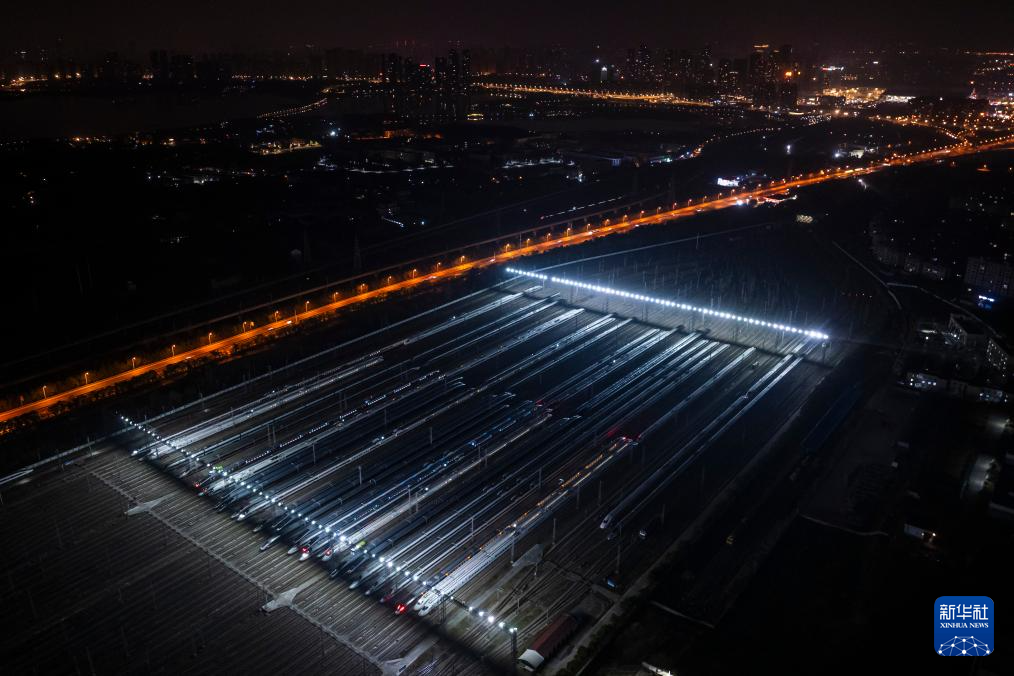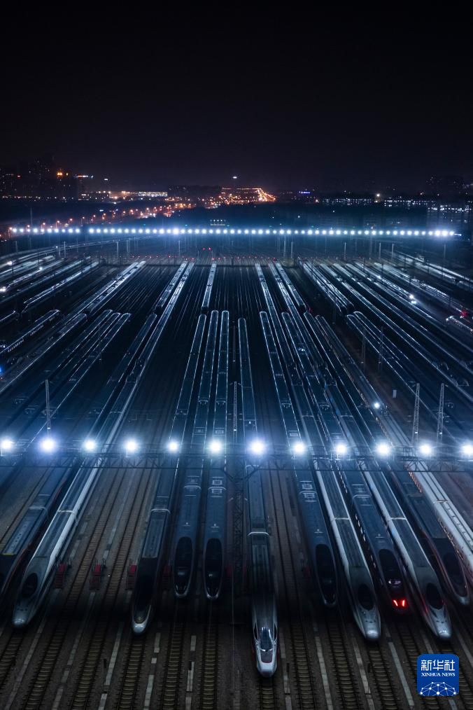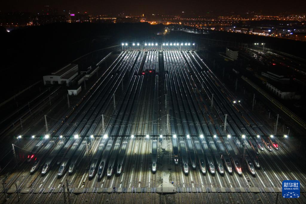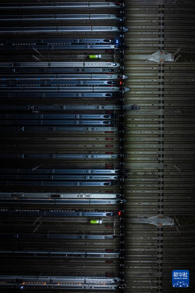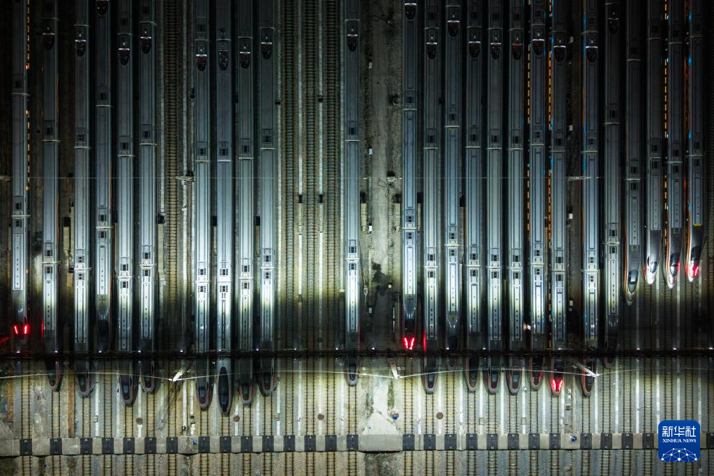 2月2日凌晨,检修完的动车组列车停靠在长沙动车运用所(无人机照片)。新华社记者 陈思汗 摄