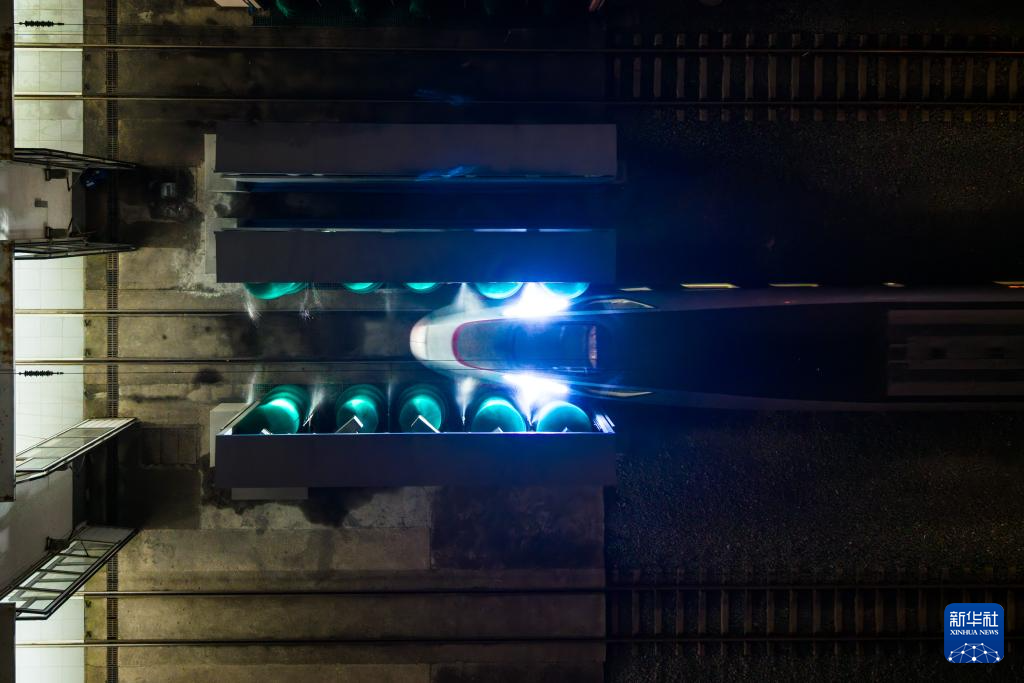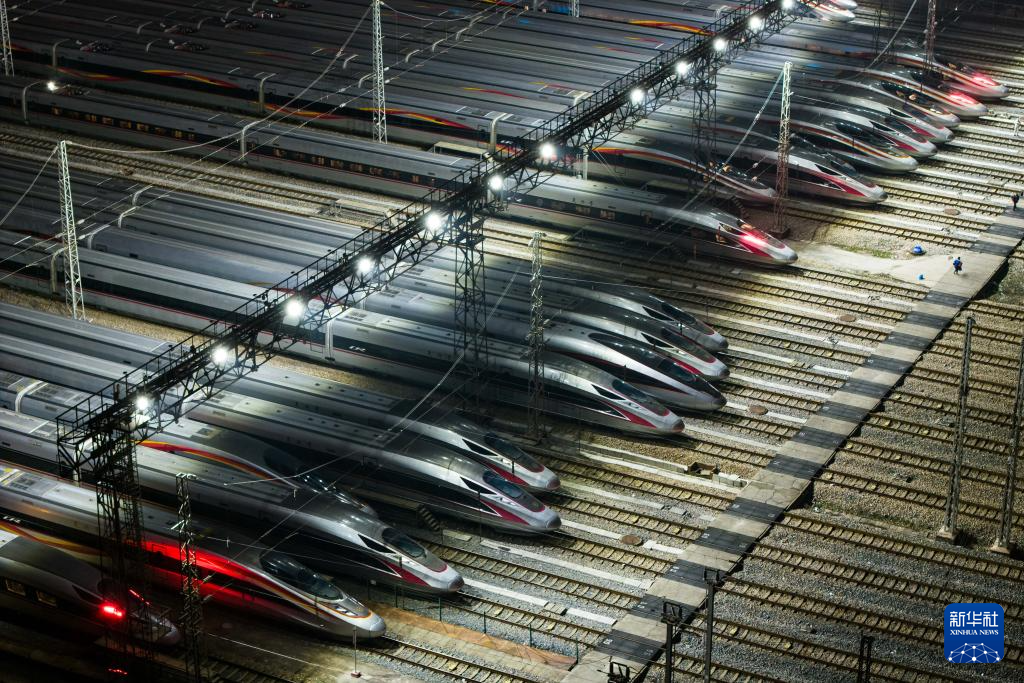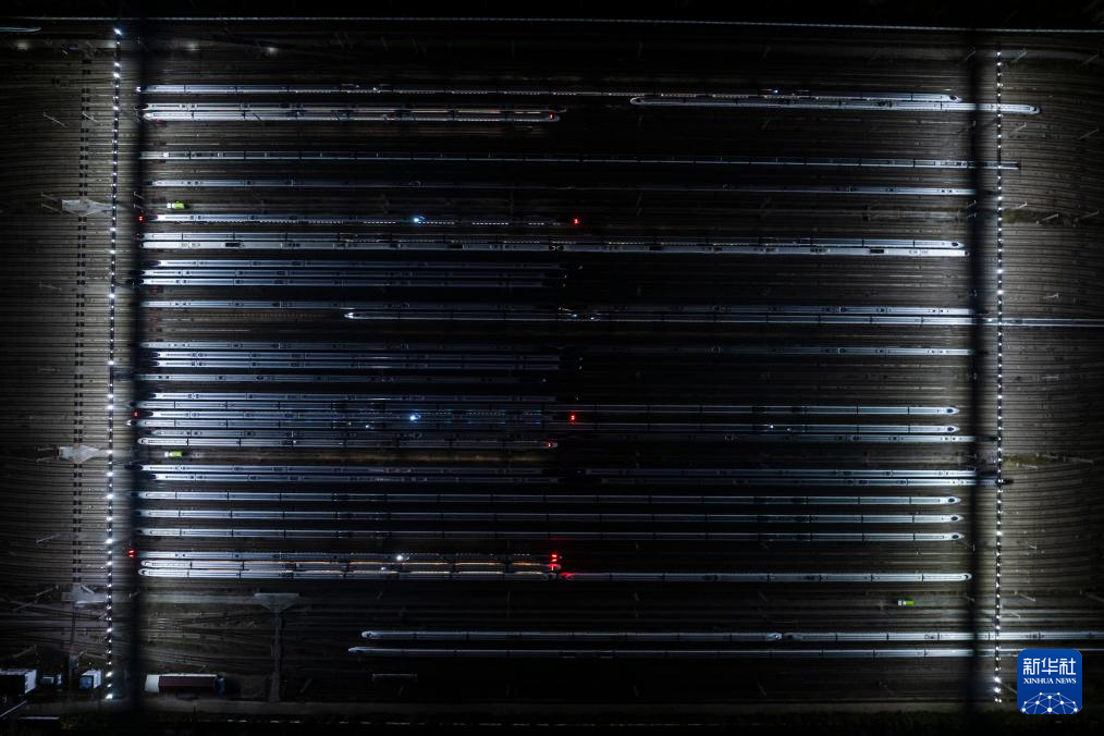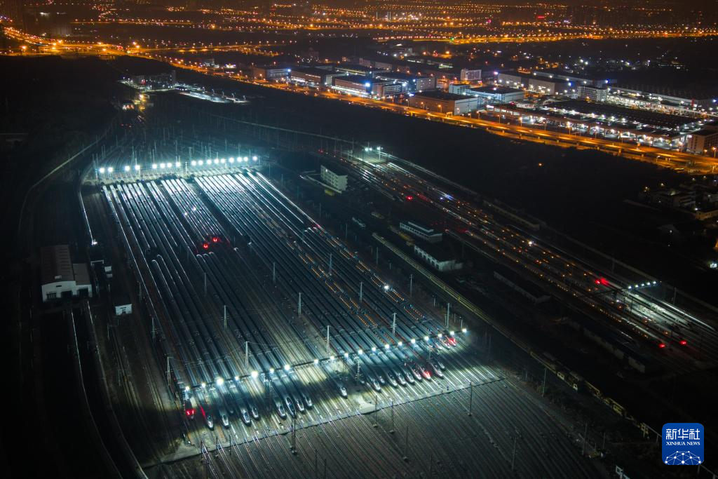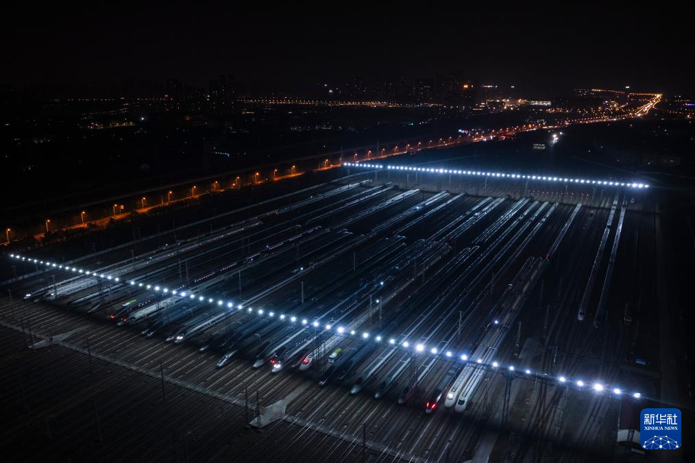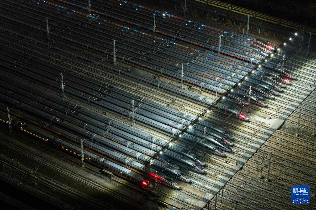 2月2日凌晨,检修完的动车组列车停靠在长沙动车运用所(无人机照片)。新华社记者 陈思汗 摄