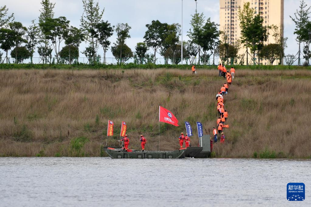 6月26日,防汛抢险应急演练人员利用应急动力舟桥转移“被困群众”。