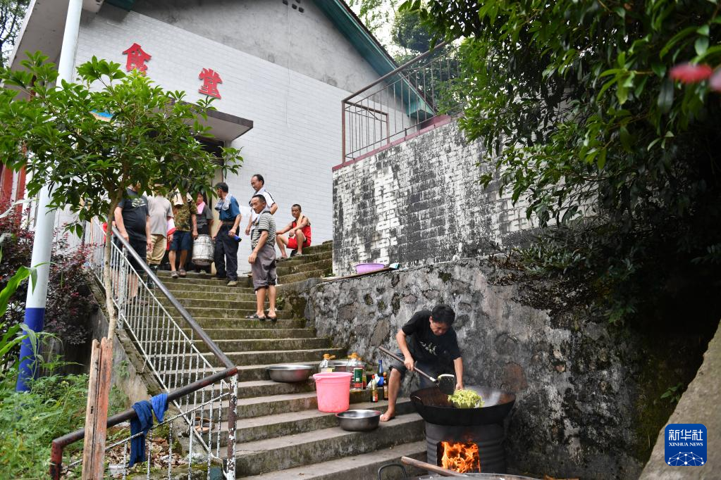 7月2日,村民在湖南省湘西土家族苗族自治州古丈县岩头寨镇草潭村一学校内集中用餐。新华社记者 陈振海 摄