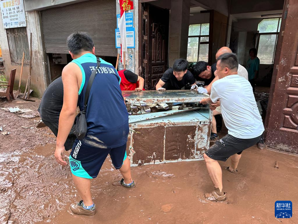 7月2日,在湖南省湘西土家族苗族自治州古丈县岩头寨镇草潭村,志愿者协助村民清理家中受损家具。新华社记者 谢奔 摄