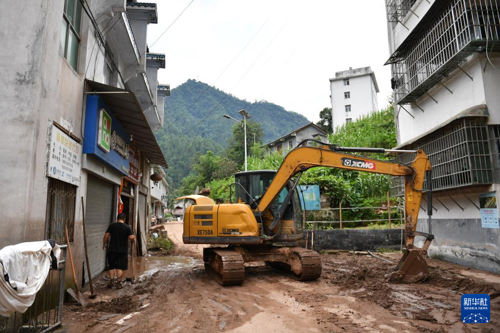 7月2日,在湖南省湘西土家族苗族自治州古丈县岩头寨镇草潭村,村民驾驶挖掘机清理淤泥。新华社记者 陈振海 摄