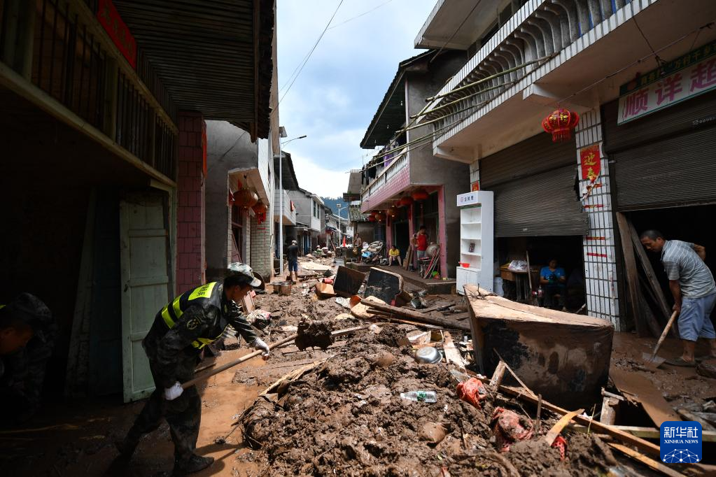 7月2日,在湖南省湘西土家族苗族自治州古丈县岩头寨镇草潭村,当地应急民兵协助村民清理淤泥和垃圾。新华社记者 陈振海 摄