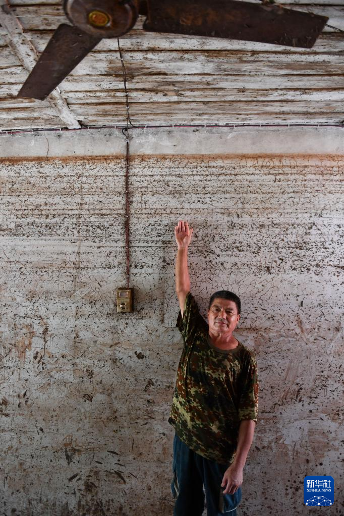 7月2日,在湖南省湘西土家族苗族自治州古丈县岩头寨镇草潭村,村民指出洪水在家中留下的痕迹。新华社记者 陈振海 摄