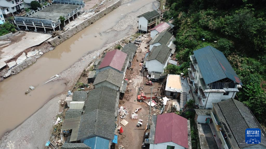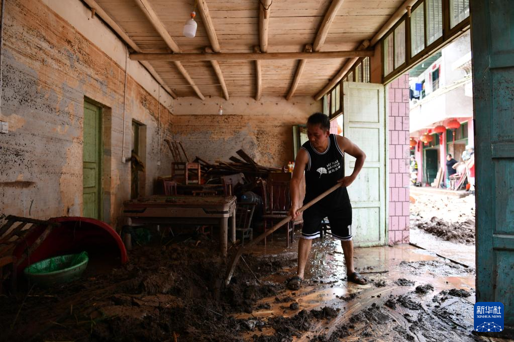 7月2日,在湖南省湘西土家族苗族自治州古丈县岩头寨镇草潭村,村民在清理家中淤泥。新华社记者 陈振海 摄