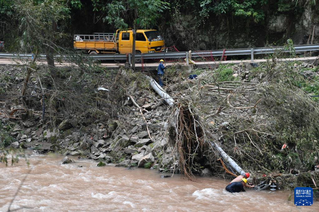 7月2日,工人在湖南省湘西土家族苗族自治州古丈县岩头寨镇草潭村抢修电力设施。新华社记者 陈振海 摄