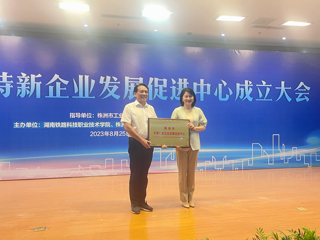 8月25日,株洲市专精特新企业发展促进中心在湖南铁路科技职业技术学院成立。株洲市委常委、副市长、株洲经开区党工委第一书记王庭恺为株洲市专精特新企业发展促进中心授牌,宣布促进中心成立。