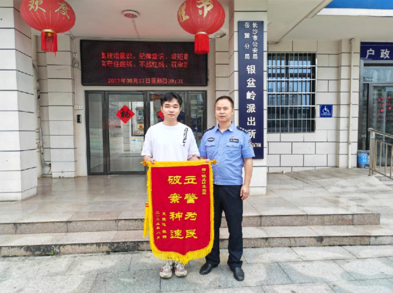 “民警同志,您真是破案神速,谢谢!”8月29日上午,王先生来到银盆岭派出所,送上一面写有“立警为公,破案神速”的锦旗,向民警表示感谢。