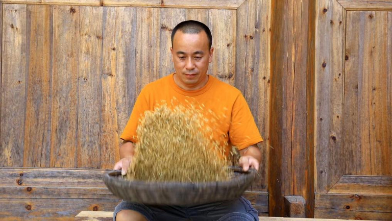 在湖南省新化县紫鹊界村,罗忠林在家中筛谷子(2022年7月23日摄)。新华社发(受访者供图)