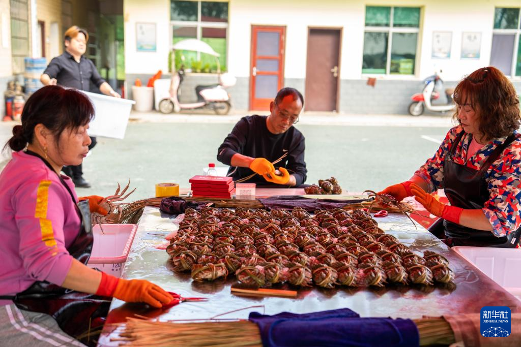 10月14日,在湖南省益阳市河坝镇沙堡洲村,蟹农在捆绑大闸蟹。新华社记者 陈思汗 摄