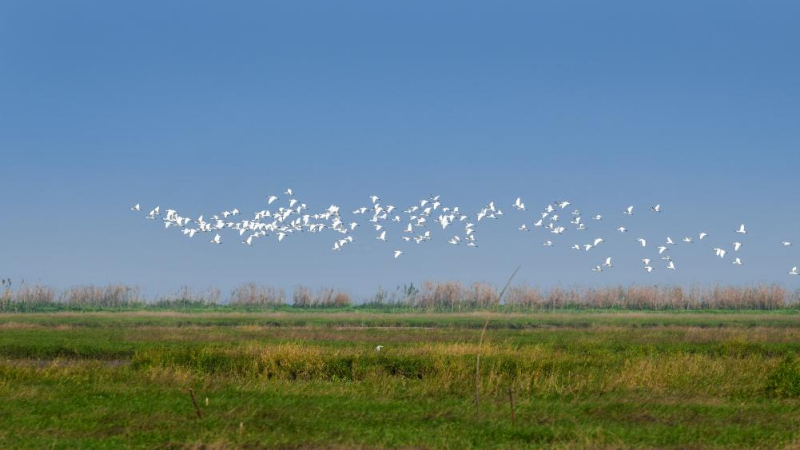 金秋暖阳下,横岭湖省级自然保护区内,碧水映蓝天,芦苇随风摇曳,远处洲滩上,一群野鸭正在悠闲觅食,三三两两的白琵鹭在栖息,几只豆雁从草丛里展翅飞出,静谧多日的湿地变得热闹起来。
