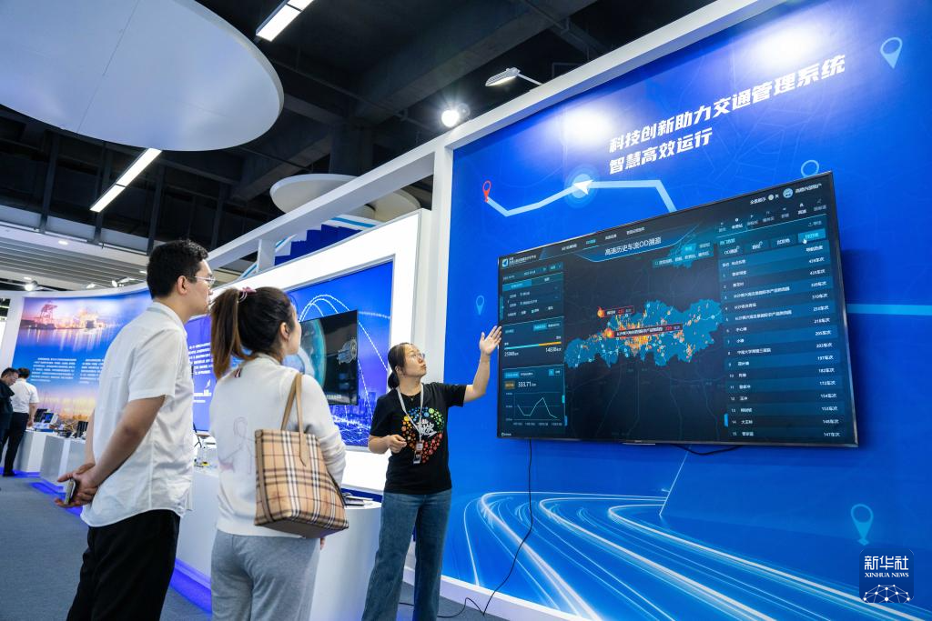 10月26日,在株洲国际会展中心,工作人员(右一)向观众介绍北斗技术在交通管理系统中的应用。新华社记者 陈思汗 摄