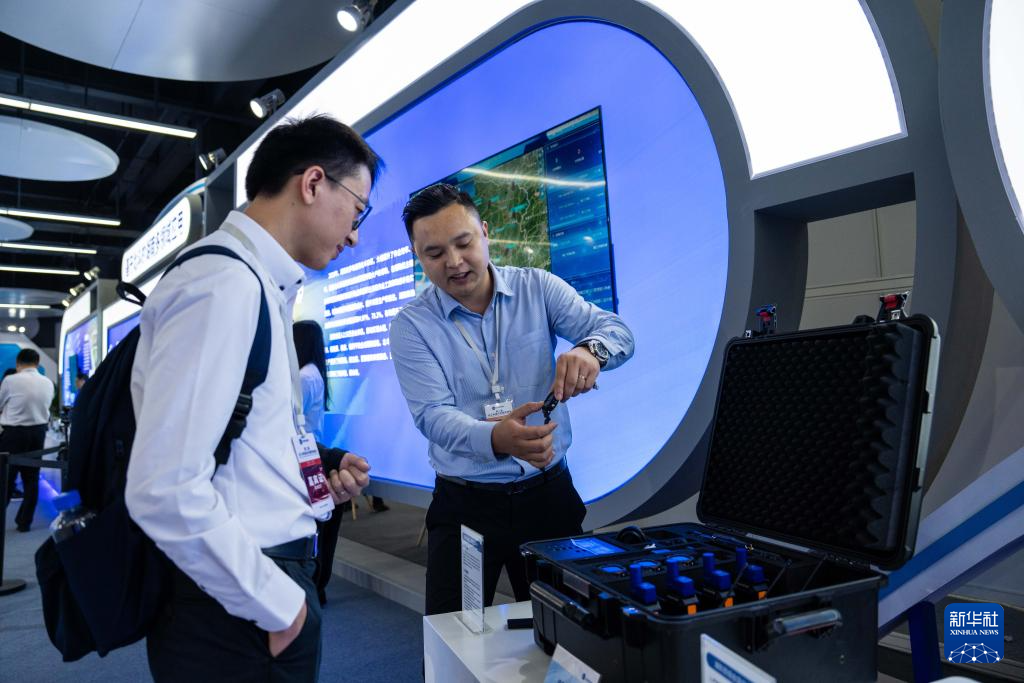 10月26日,在株洲国际会展中心,工作人员(右)向观众介绍一款应用北斗技术的可穿戴定位设备。新华社记者 陈思汗 摄