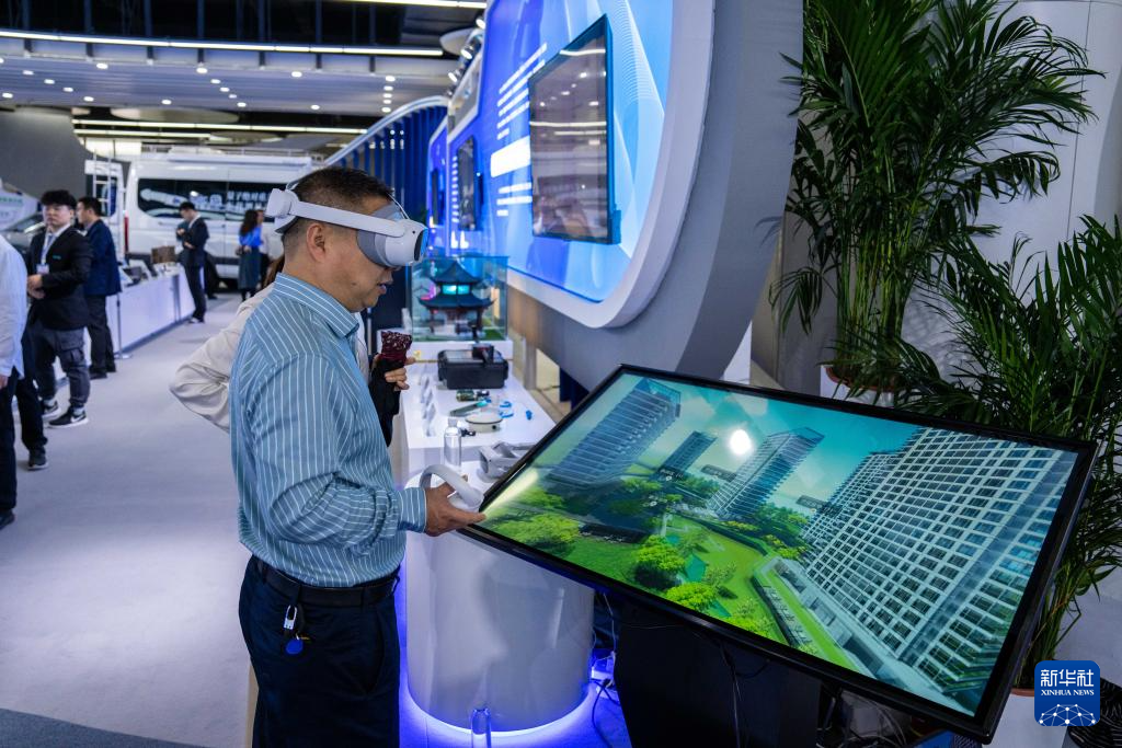 10月26日,在株洲国际会展中心,观众穿戴VR设备体验利用北斗技术辅助建模的地图仿真模型。新华社记者 陈思汗 摄