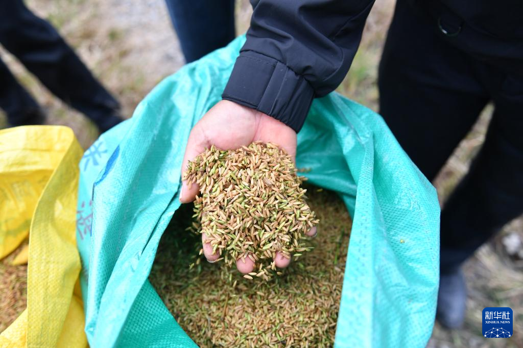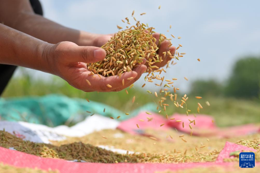这是8月10日在娄底市双峰县印塘乡盐井湾村“稻再油”示范片拍摄的头季稻谷。新华社发(李建新摄)