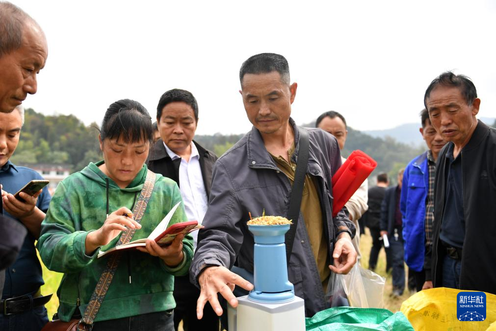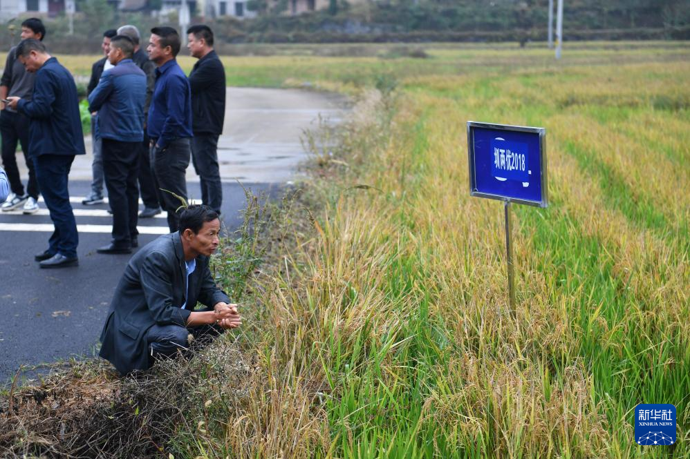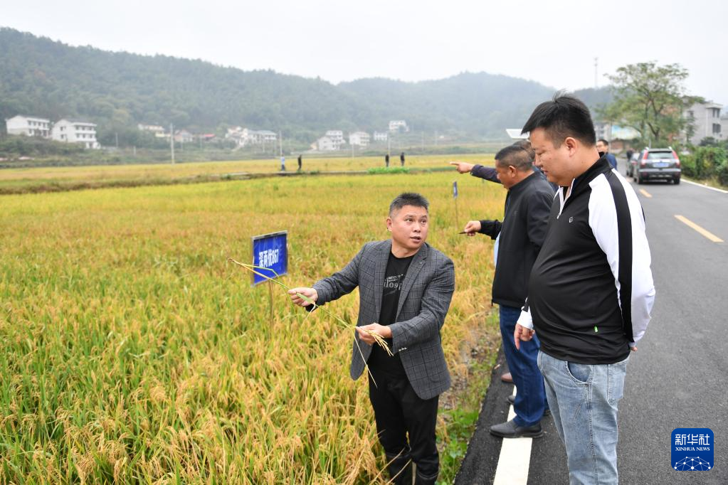 10月28日,在娄底市双峰县石牛乡上茶村,种粮大户们观摩不同品种的再生稻。新华社记者 陈振海 摄