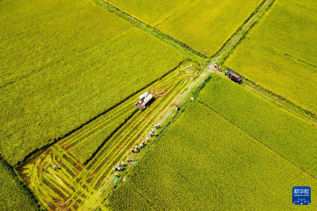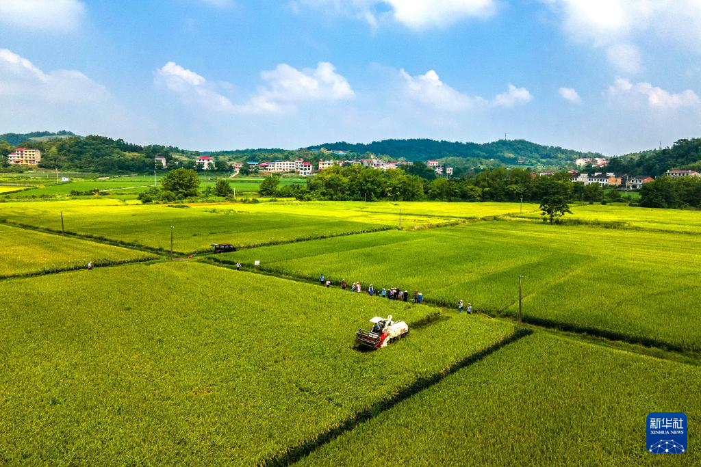 8月10日,在位于娄底市双峰县印塘乡盐井湾村的“稻再油”示范片,农机手驾驶收割机收割头季稻谷(无人机照片)。新华社发(李建新摄)