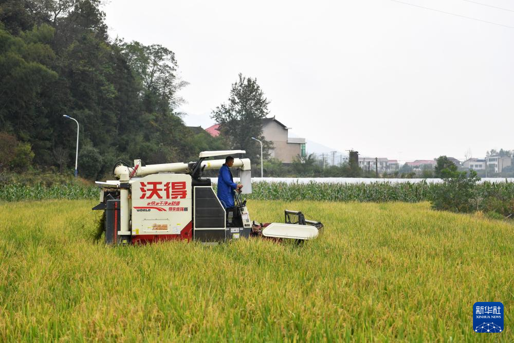 10月28日,在位于娄底市双峰县永丰街道松坪村的“稻再油”示范片,农机手驾驶收割机收割再生季稻谷。新华社记者 陈振海 摄