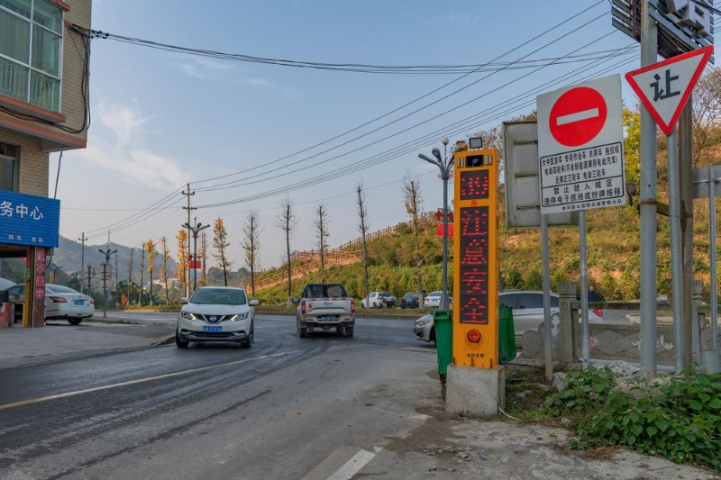 这是湖南省会同县林城镇342省道和文渊南路交叉口设立的“智能哨兵”预警系统。 张镭 摄会同县公安局交通管理中心主任唐家庆表示,该路口车流量较大,路旁有房屋阻挡,视线不佳,驾驶员往往很难提前发现其他方向的来车,且车辆抢行现象普遍,之前交通事故时有发生。