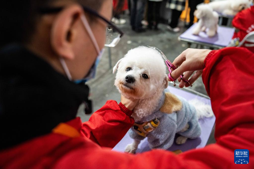 12月2日,在长沙红星国际会展中心,参展商在给宠物狗整理毛发。