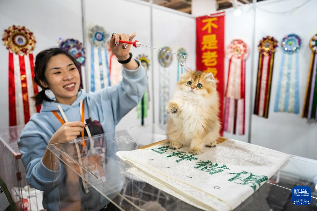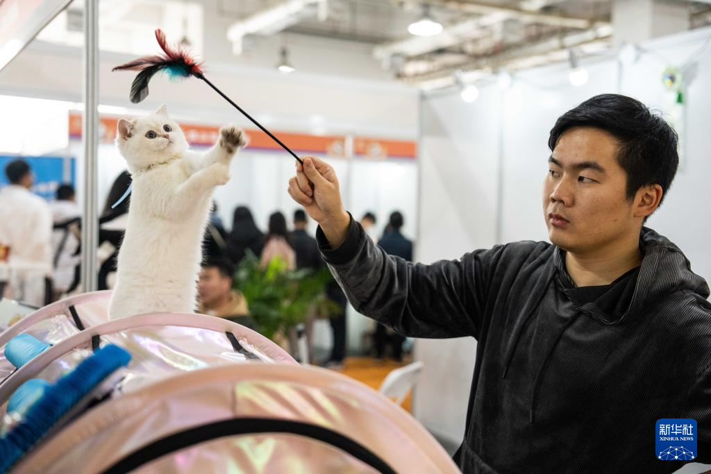 12月2日,在长沙红星国际会展中心,参展商在逗猫。