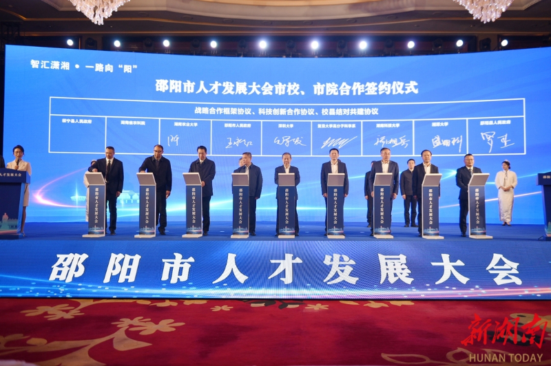 会议现场还举行了《邵阳院士》新书首发仪式和合作签约仪式。邵阳市与深圳大学、湘潭大学、湖南农业大学、湖南科技大学、湖南省农业科学院、复旦大学高分子科学系签订市校(市院)合作协议;全市10个“揭榜挂帅”科技项目和重大科技人才项目同步签约。