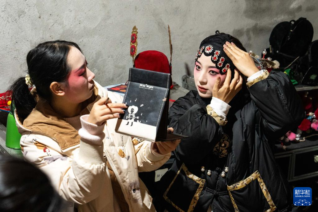 1月15日,在伊塘镇长木塘村,演员在后台做演出前的准备工作。新华社记者 陈思汗 摄