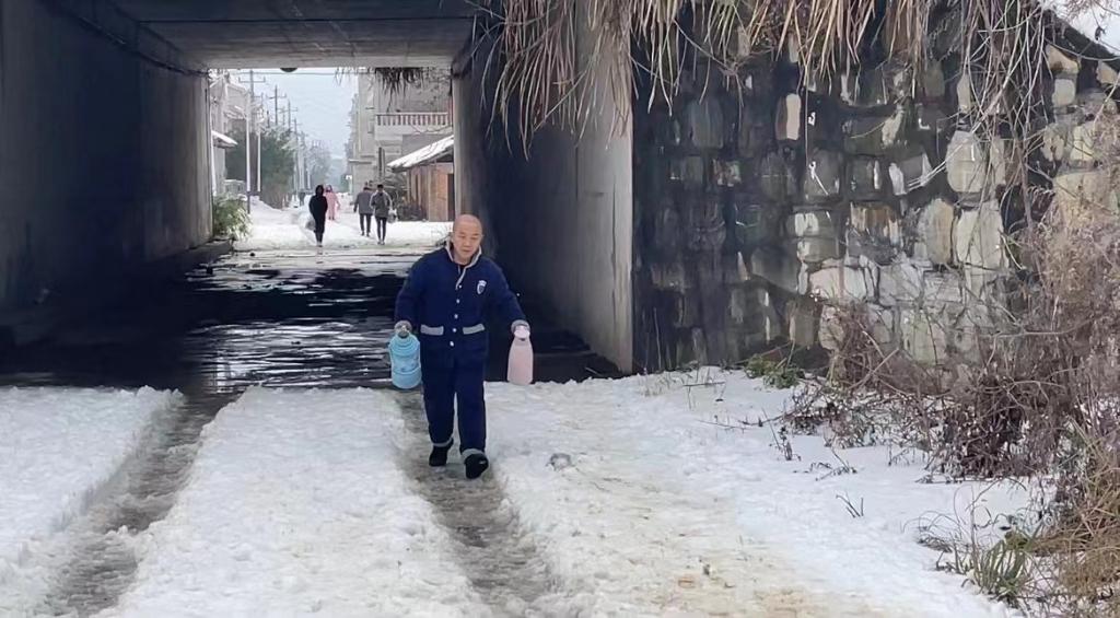 2月4日,在常张高速木塘垸段,曾保安提着两壶刚烧开的热水朝高速赶去。新华社发