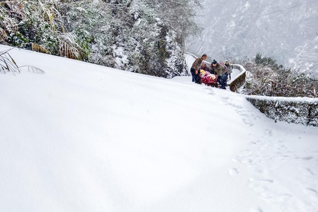 10位村民接力抬起担架,人们踩在厚厚的雪里,每一步都十分艰难。里衣被汗水浸湿后,寒风变得愈加刺骨。