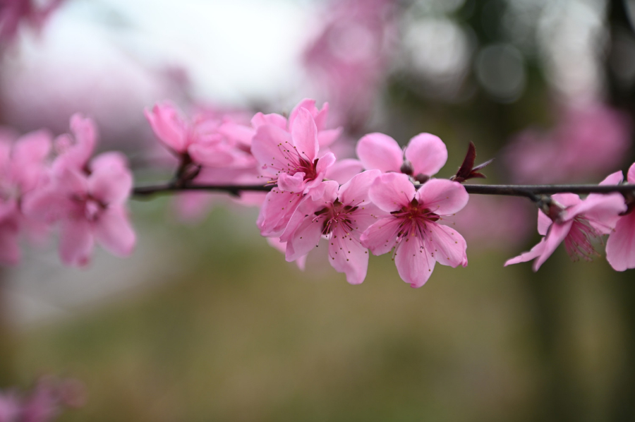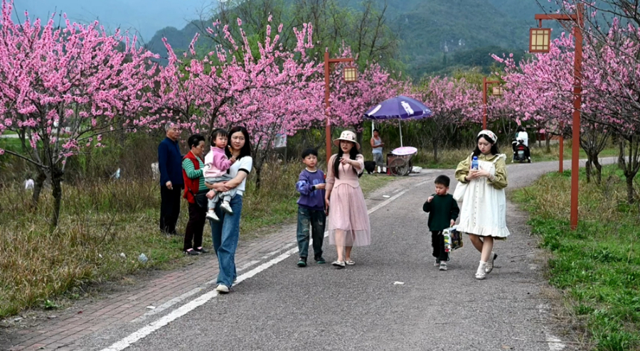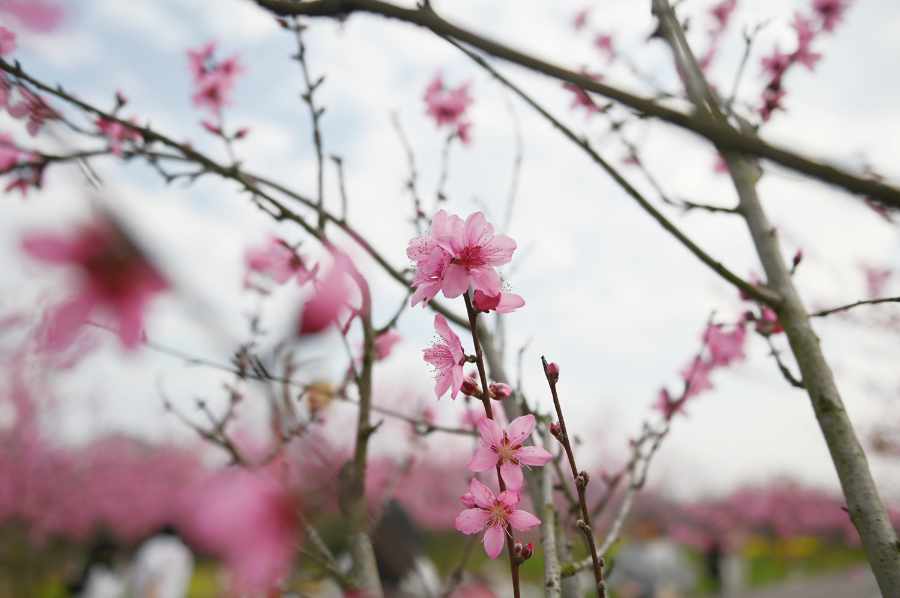 漫步在桃园中,只见一株株桃树参差错落、姿态万千,一团团、一簇簇的桃花在历经春寒料峭之后傲然盛开,娇艳欲滴。